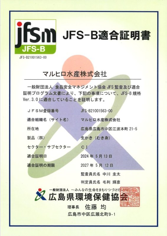 お客様に「安心・安全・新鮮」でおいしい商品をお届けできるよう、2021年6月に食品安全マネジメント規格「JFS-B」の適合証明を受けました。